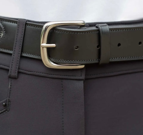The Equinavia Erika Crystal Bit Belt, crafted from smooth black bridle leather, features a row of elegant silver bit ornaments, each delicately inlaid with black crystals for a refined shimmer. Finished with a simple silver-colored buckle and a 1 1/2-inch width, this belt is both stylish and functional for everyday wear or adding a subtle shine on show day.