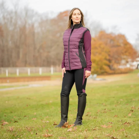 The Equinavia Heidi Women’s Insulated Riding Vest features 120g of poly fill insulation in the channel-quilted front and lower back which effectively traps heat at the core. Stretch nylon side panels offer enhanced flexibility and a contoured fit, making it ideal for layering during cold-weather rides. The double-layer stand-up collar and elasticized armholes help block wind, while durable YKK zippers on the front and pockets ensure longevity. A tonal ribbon detail adds refinement, and the solid upper back panel allows for custom barn or team embroidery.